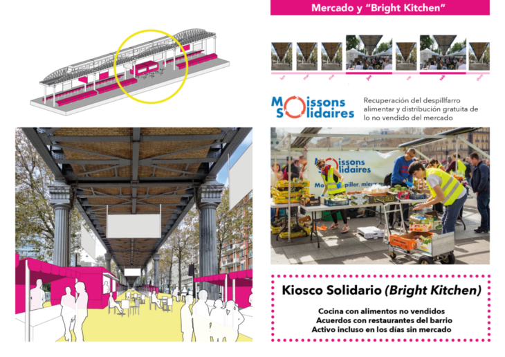 Algunas de las nuevas funciones propuestas complementan la oferta y el funcionamiento de las funciones preexistentes, como el caso del espacio destinado al mercado de barrio. Aquí, gracias a la presencia y el trabajo de asociaciones como Moisson Solidaire, que se ocupan de la recuperación del despilfarro alimentario y de su distribución gratuita, se propone la creación de un quiosco de comida solidaria exclusivamente a base de productos del mercado no vendidos. Esta funcionalidad facilita el atractivo del espacio incluso en ausencia del mercado y, al mismo tiempo, ofrece un servicio social y de economía circular útil para la ciudadanía (especialmente la que se encuentra en una situación de vulnerabilidad económica).