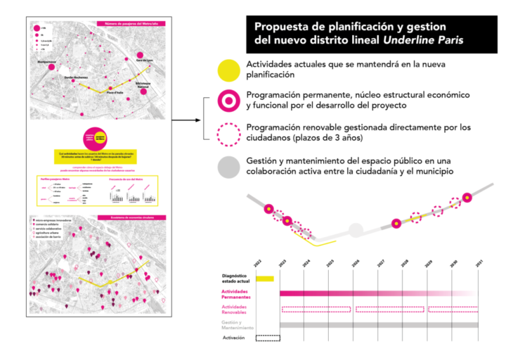 El programa urbano de Underline Paris destina una gran parte del espacio urbano a funciones intercambiables y reversibles en el tiempo. Se propone confiar la propuesta funcional de estos espacios a las asociaciones de vecinos y a las microempresas locales a través de concursos públicos que definan su gestión por una duración de 3 años. Así, se busca involucrar al máximo a los recursos locales, invitarles a tomar posesión del espacio de forma activa y garantizar el dinamismo de la oferta mediante una rotación