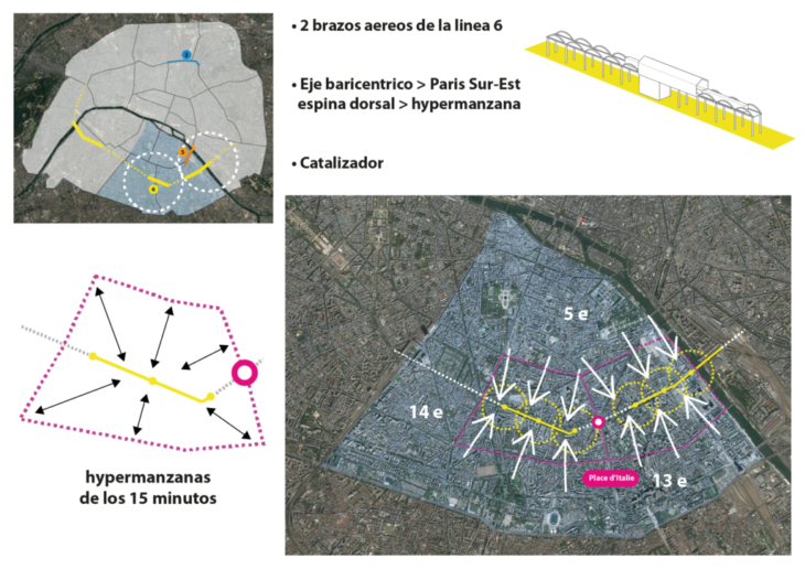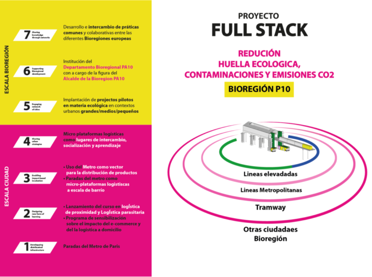 Esta nueva visión del espacio público conectado a estaciones elevadas forma parte de un proyecto Full Stack que afecta a toda la Biorregión P10 “Bosques mixtos costeros” de Europa occidental”, en la que París se coloca en una posición central. Este enfoque sistémico tiene como objetivo la reduccíon de la huella ecologica, del índice de contaminación de las emisiones de CO2, y está estructurada en dos partes.