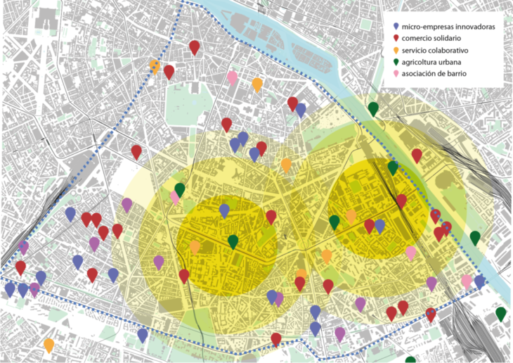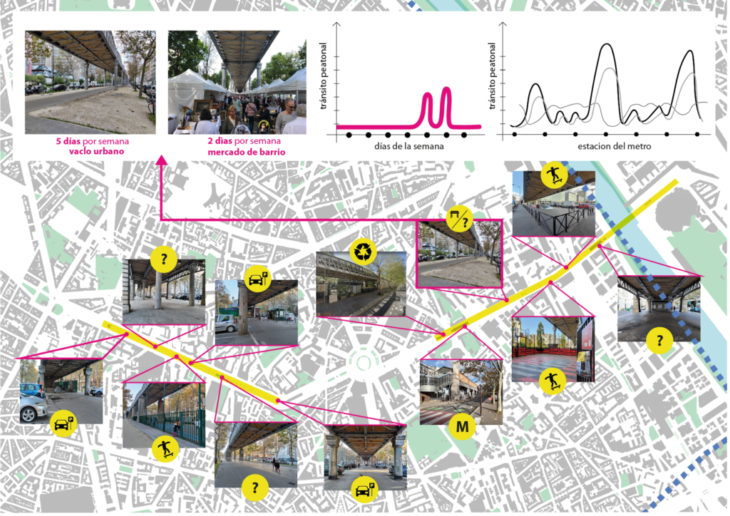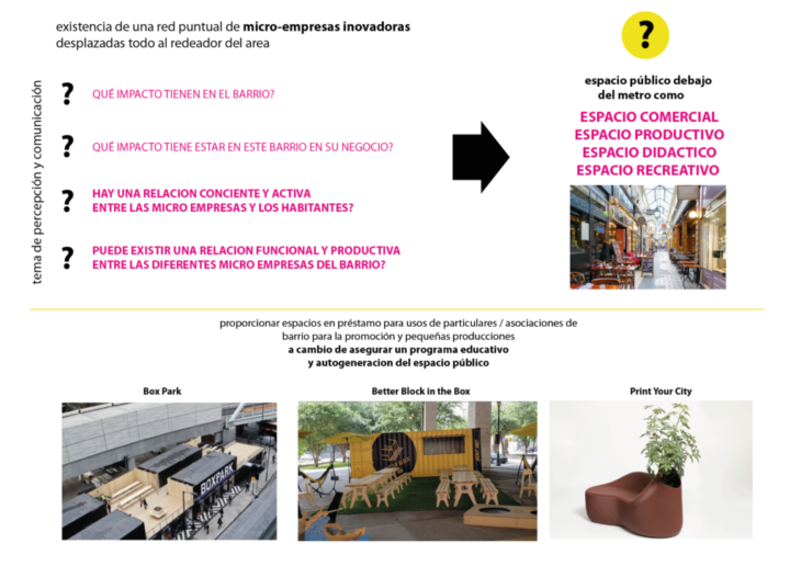 Dentro y alrededor de las híper-manzanas mencionadas, existe un rico tejido de microempresas innovadoras y actividades relacionadas con el mundo de la agricultura urbana, el comercio solidario y las asociaciones de vecinos. El espacio debajo del metro podría ser, por lo tanto, un espacio estratégico para implementar posibles relaciones y colaboraciones entre las diferentes realidades y al mismo tiempo actuar como un escaparate / galería comercial, en una re-interpretación de los “passages couverts” de París.