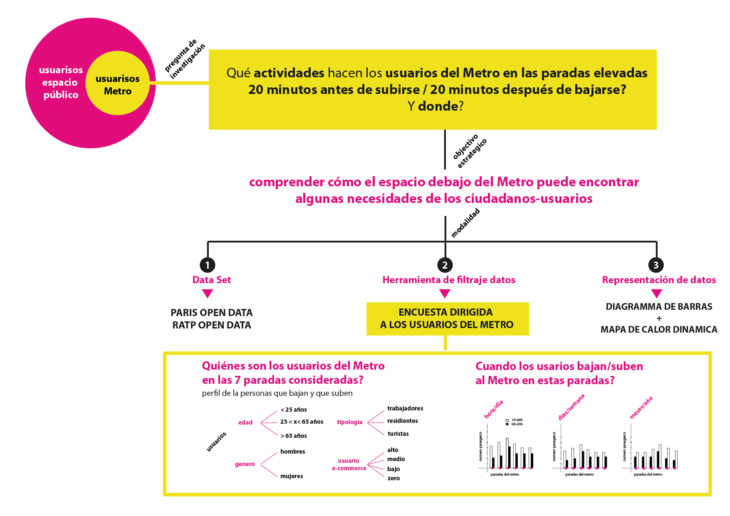 La relación intrínseca del espacio urbano considerado con la infraestructura suprayacente sugiere una profundización funcional del tipo de uso y relación entre el contexto y los usuarios del metro en las paradas en examen. El objetivo es entender a través de una pregunta de investigación específica cómo el sitio podría responder a las necesidades y requerimientos de este tipo de usuarios. En esta intención, se propone una encuesta dirigida a los usuarios del metro, dirigida a analizar su perfil (género, tipos, edad, hábitos) y la frecuencia de uso y paso a medida que varían las horas, días y meses del año.
