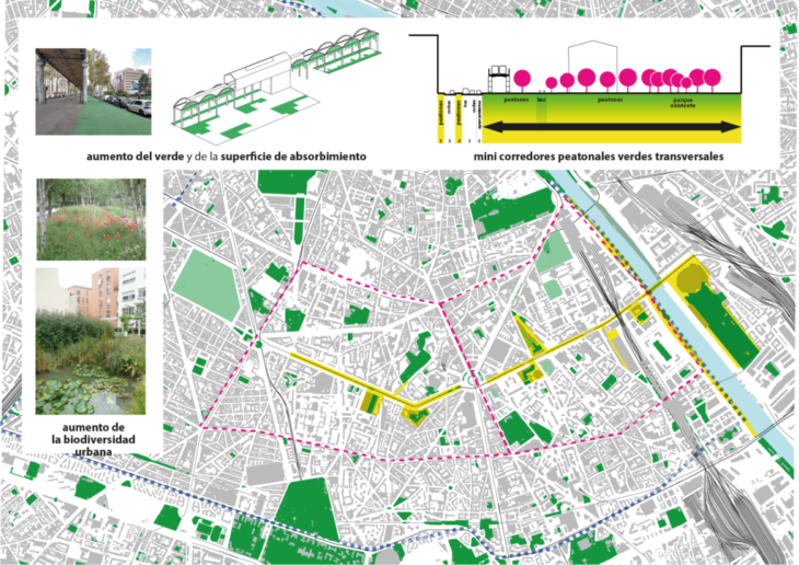• crear un corredor longitudinal en la ruta este-oeste que conecte con el area peatonal y con el carril bici a lo largo de las orillas del Sena