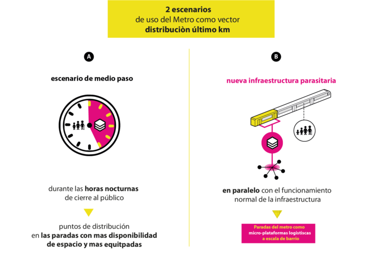 En un primo momento se asume el uso del metro como vector de distribucion de productos durante las horas nocturnas de cierre al público. En un segundo tiempo, se propone desarrollar una infraestructura parasitaria a la infraestructura existente que permita el transporte de mercancías en paralelo con el transporte de personas, dedicando un vagón de metro a esta nueva funcionalidad y operando durante las horas de menor afluencia del servicio.