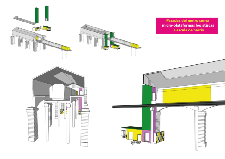 En este segundo escenario, las paradas de metro se configuran como micro plataformas logísticas a escala de barrío. A través de ascensores, las mercancías descienden al nivel del suelo y se clasifican de dos maneras diferentes. Por un lado, los productos de comercio electrónico se almacenan en cajas especiales, listas para ser recuperadas por usuarios privados. Por otro lado, los bienes destinados a comercios de barrio se cargan en vehículos ligeros propulsados por electricidad y distribuidos ad hoc. También hay un espacio técnico de uso logístico que integra aparcamiento y punto de recarga para bicicletas eléctricas destinadas a la distribución.