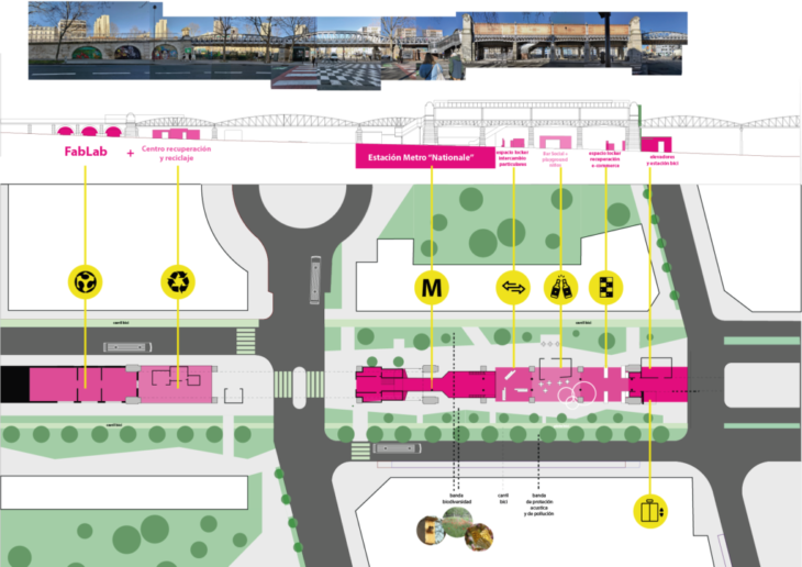 Como ejemplo, con referencia a la parada Nationale, se propone un bar social con parque infantil para niños, un espacio equipado con un sistema de intercambio de mercancías de segunda mano, y en la parte semi subterránea, la instalación de un fab-lab en continuidad con el centro de recuperación existente y el reciclaje de materiales.