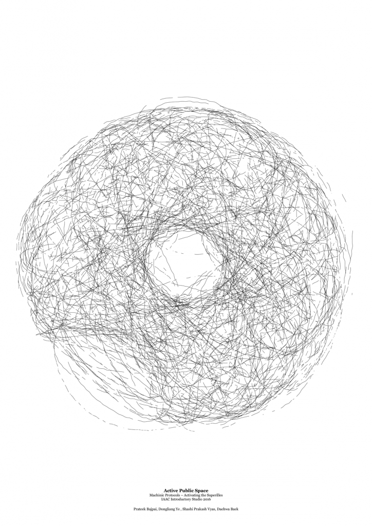 The mechanism initiates a triangular disc to rotate around a central axis in a circular path and consists of a suspended arm with two black ink pens on both the ends of the arm. The free suspended arm allows for discontinuous lines on the site (sheet of A1 paper) and the inflation of the balloon deflects the pens from their fixed paths of revolution.