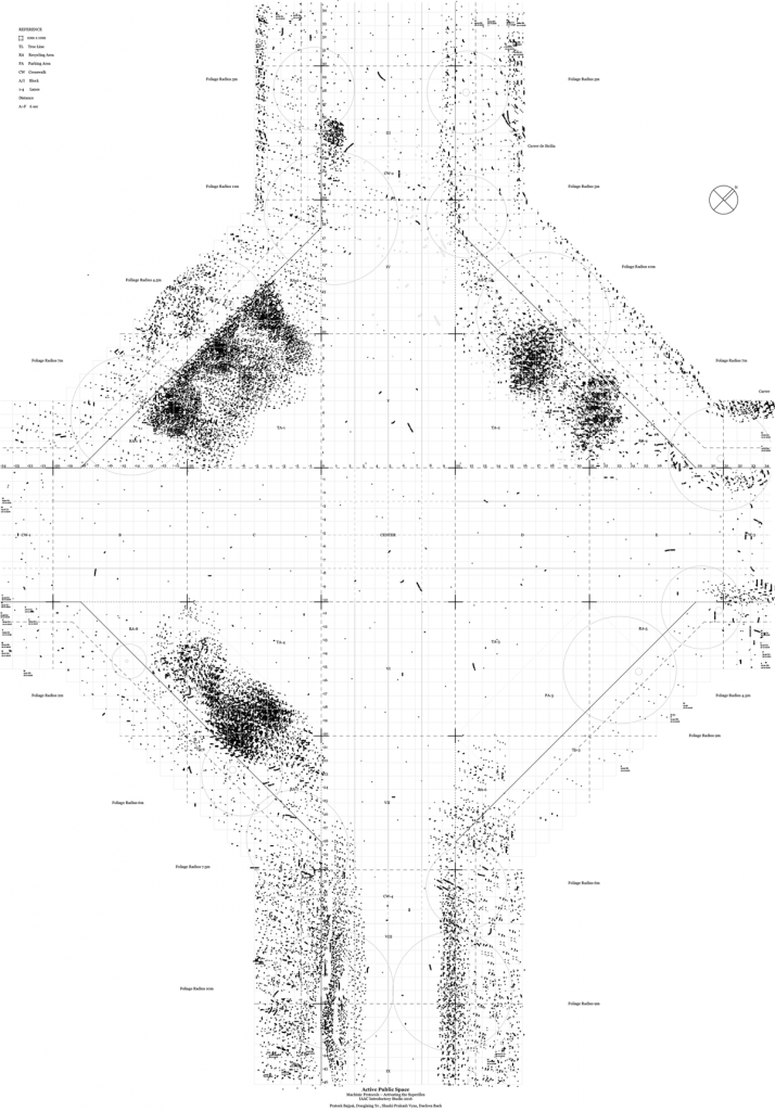 The mapping exercise at the intersection of Carrer de Sicilia and Carrer de Sant Antoni Maria Claret was focused on collecting information that quantifies the concentration of dead leaves at the intersection. The parameters that can account to the accumulation of dead leaves after their drop from the tree are many fold and to name a few; wind flow, vehicular movement, pedestrian flow and the regular or irregular cleaning of the streets are a few. Each dot on the drawing represents a dead leaf and the concentrated patches of these leaves suggest that certain regions of this intersection are not being actively used than others.