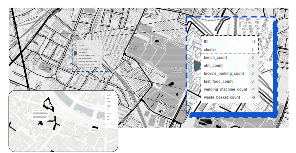 For our web interface you can see in light green on the dark layer its showing all the identified voids in vienna when hovered pops up different amenity features it has. This could be then laid over by another layer that shows a tiled heat map that show the density distribution of that particular amenity.