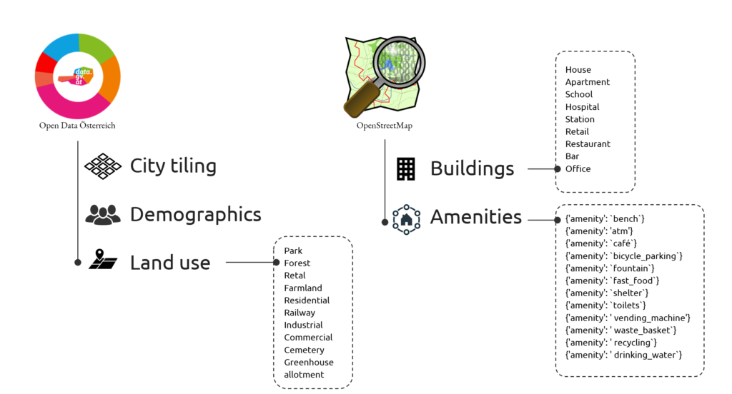Data about the city can be gathered from open sources such as Open Street Maps and government websites like in the case of this project. Data could further be collected about amenities for example through manual collection or through image segmentation of street images to collect counts of certain amenities.