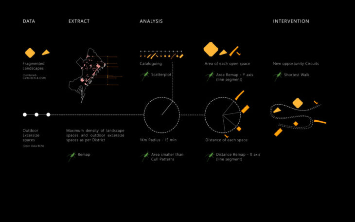The Study focuses on establishing new networks for fragmented landscape spaces in Barcelona. The objective was to understand the relation between the Urban Landscape tissues in respect to fitness parks, sports, leisure and the isochrones of 15mins by walk from the Outdoor exercise spaces in the Metropolitan Area of Barcelona.