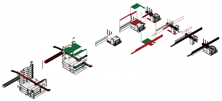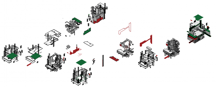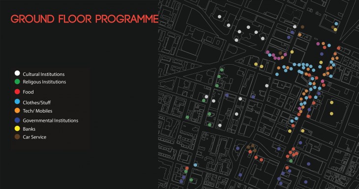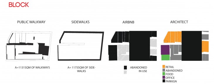 As a quick description of the project; it is a collection of interventions, that are the outcome of a system that translates how people experience the city, and how the city is evolving to possible changes. Changes happen on the level of architectural elements, such as walls, slabs, stairs, to materiality – changing some surfaces to change the utility- and finally adding possible connections from one space to another which are to grow to neighboring blocks and overtake the city in the future – not to mention the emergence of new programmes on different levels which as well is an indicator to the evolution and the interventions made on the block.