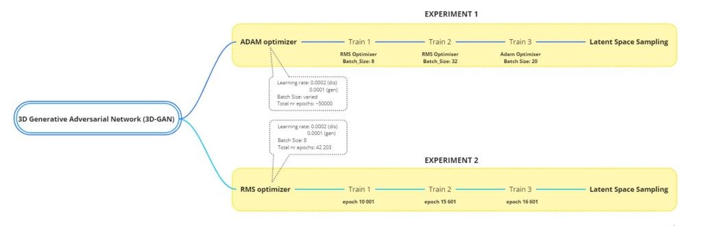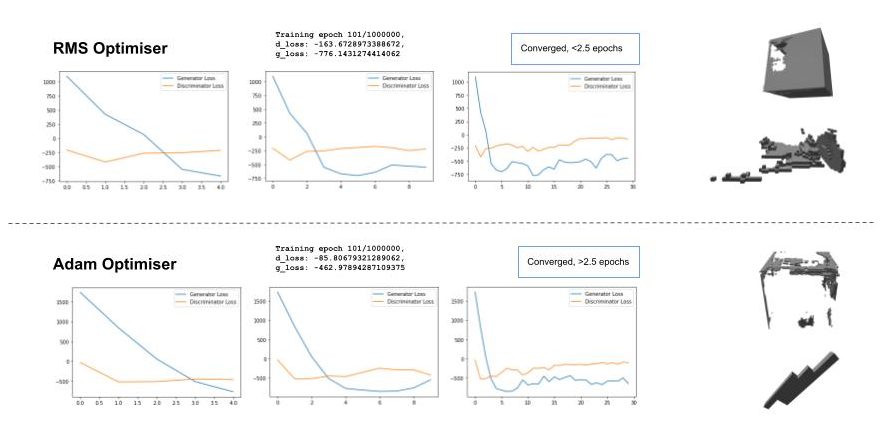 However we become vary of not testing the RMS vs ADAM optimizer on our point cloud dataset, of which, the graphs convey not much difference in training, although the gap between generator and discriminator differs slightly. Priority was given to the object generation, where one clearly differs from the other. The RMS had more closely packed voxels.