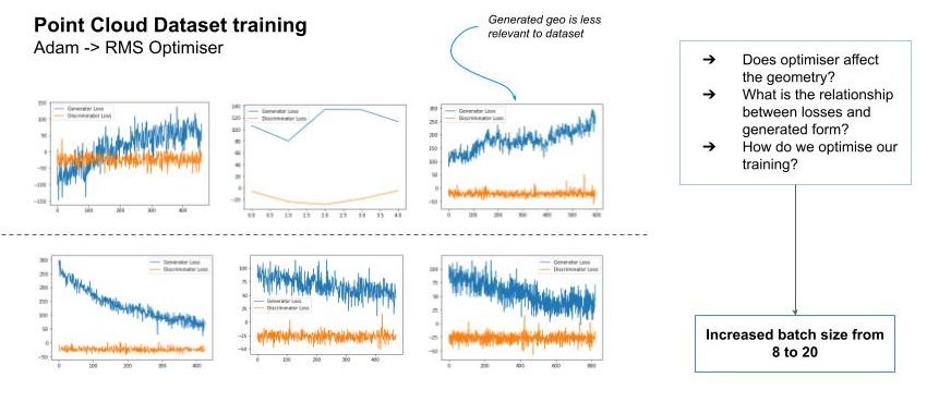 Giving the RMS a go we speed up learning using a batch size of 32, but soon figure that the graph just proceeds to diverge and the generated geometry is less relevant or in sync with our starting dataset. We decide to go back to ADAM, increase the batch size to 20, and not 32 since it wasn’t acceptable to the Google Colab GPU limitations. It is noticeable how quickly the losses are directed to converge.