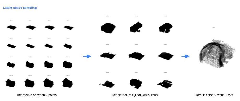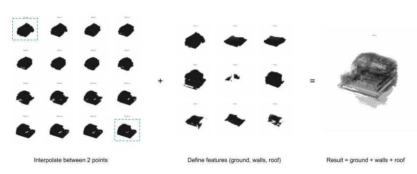 This was then sampled in the latent space, where interpolation was initiated from A to B. Features were selected in terms of ground walls and roof. with a successful end product.