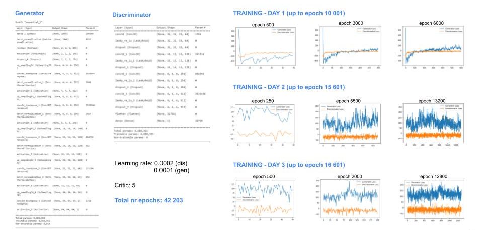 As a second experiment we used only RMS optimizer through the whole process. The training was done in 3 phases and resulted with a bit more than 42 000 epochs in total. In all 3 trainings the generator and discriminator behaved a bit differently from other trainings, with in general discriminator keeping fairly stable loss function whereas generator was more fluctuating, but still following the discriminator.