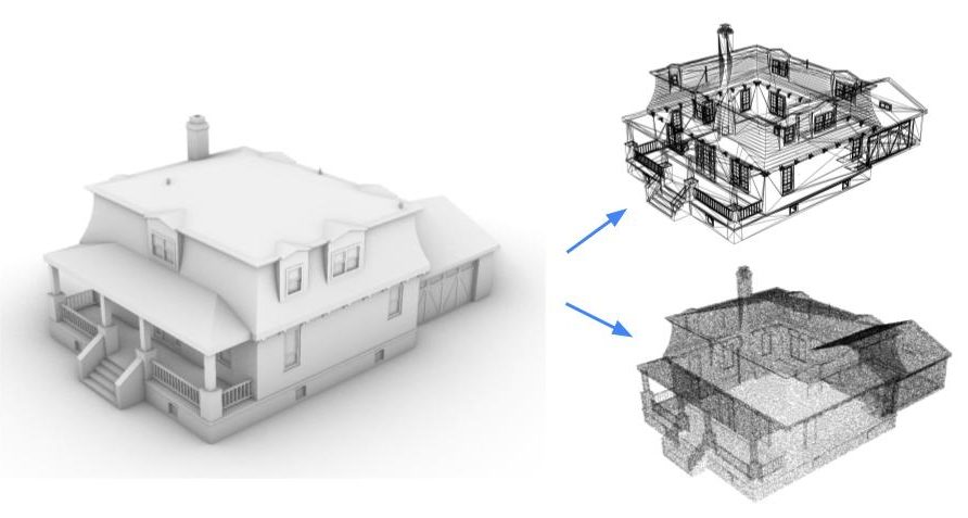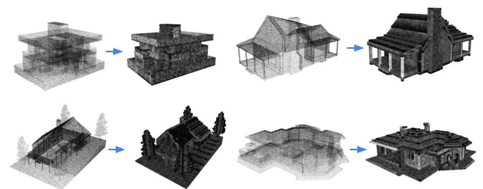 The dataset manipulation and preparation was done fully in python to save time in dealing with such large dataset. First we visualized all the mesh models to have an overview of what kind of models our dataset consisted of. Quickly it became obvious that the dataset was not as clean as we had hoped for. There were many samples with trees, cars, people and gardens attached to the buildings, and some were even missing a roof. But due to time constraints it was not possible to clean all the 1266 samples. To illustrate the differences with the voxelization result we can see here how noisy and faulty results were creates with mesh to voxel process. One small improvement was achieved with merging the segmented meshes. Whereas the point clouds created correct and clean results.