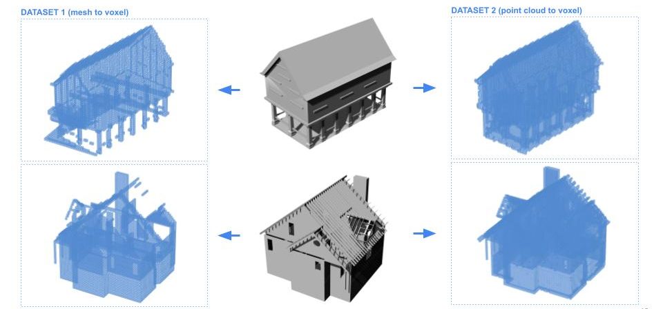 However due to complex meshing of building models the dataset created faulty voxelizations and at this point the choice was made to switch rather to the point clouds that were expected to produce more ordered voxel models. But that meant that we could proceed only with 3d GAN ML model.