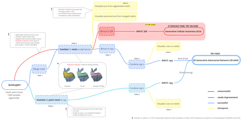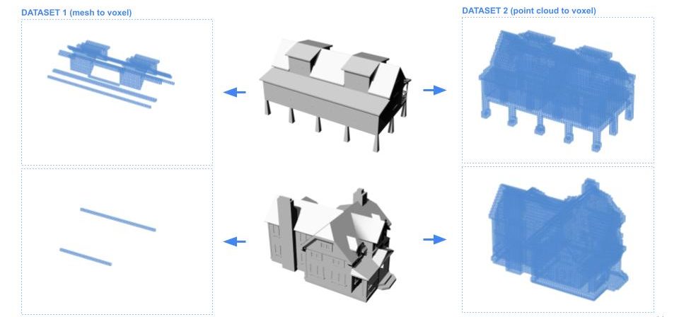 At first we considered experimenting with 2 different ML models: generative cellular automata and 3d generative adversarial network, that could learn the architectural language of existing buildings. With this in mind we started to prepare our dataset. As a case study, we acquired a dataset of residential buildings from BuildingNET which consisted of 1266 segmented samples of mesh and point cloud models. In order to satisfy the input data requirements of both ML models we needed to convert the mesh models into voxels and then to NumPy arrays.