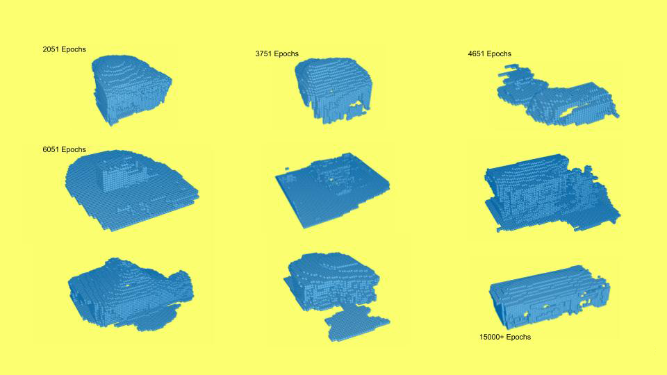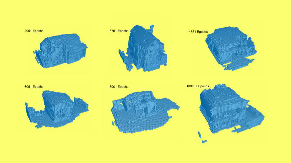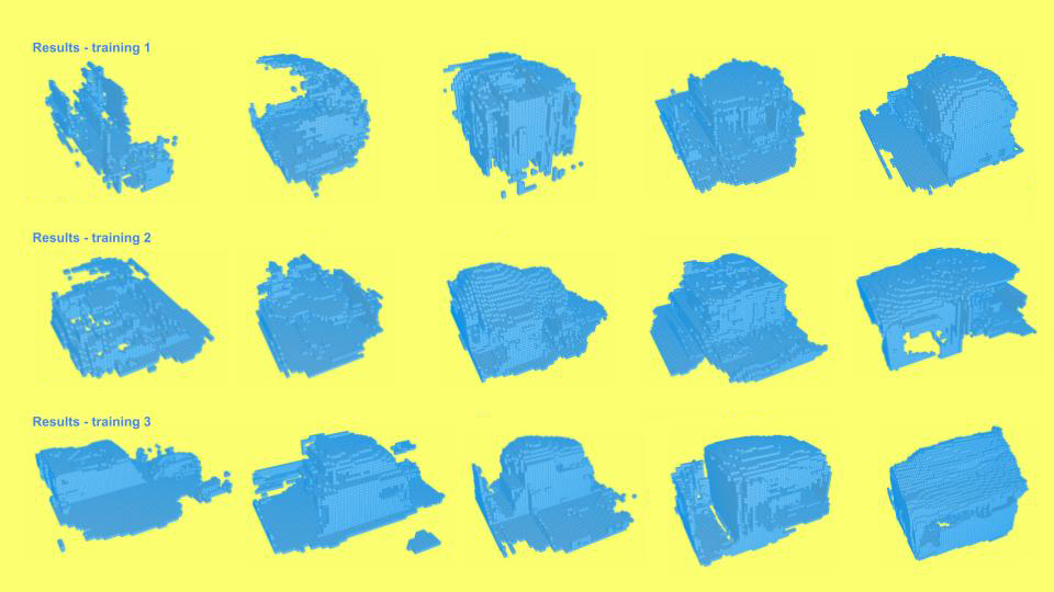 The results show slight improvement in learning through training sessions by generation of more precise and clean voxel models. It was clearly visible that the walls and gardens were more prominent features, and that the later training started to learn more the different roof shapes.