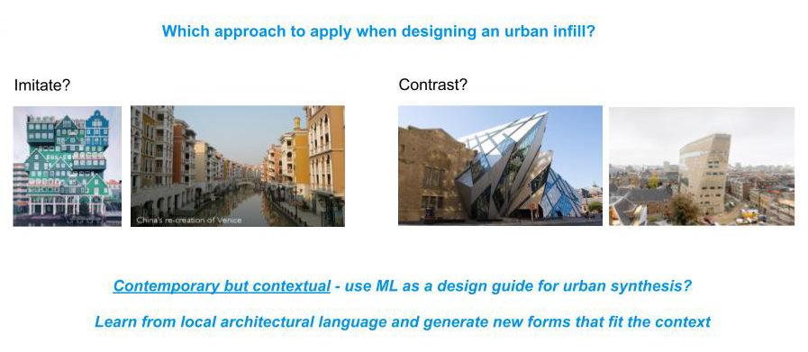 The challenge for the project was to address the design issues related to urban regeneration. As cities are in perpetual motion through creation of new and destruction of old inevitably every now and then voids will be generated into the existing urban fabric. As an architect you are then in front of a design decision of which approach to apply when creating a new building to fill that void. There are 2 extremes to choose from: either to imitate the existing architectural language or the opposite, contrast. Our proposal is to use machine learning as a tool to guide an architect in finding a golden middle way by learning from the existing architectural language to generate new forms that fit into the context.
