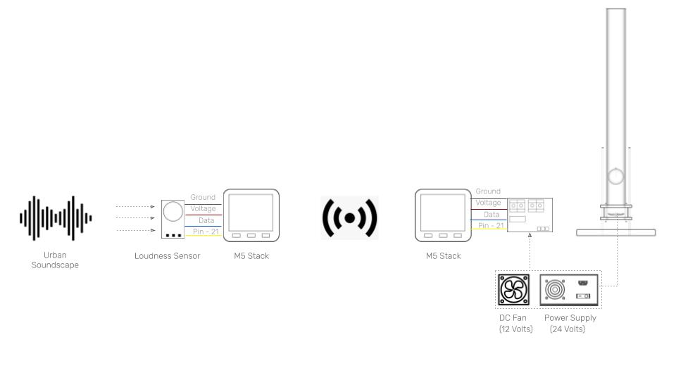 In summary, M5Stack receives values from the sound sensor and uploads them to the platform. The second M5stack reads values and processes them into analog voltage signal. By doing so, it changes speed of motors rotation. Hence, making the ball float according to the frequency of the sound. The higher the frequency, the higher the ball floats. The experiment could be used to visualize and compare real-time public space condition in different areas of the city, or act as an art installation.
