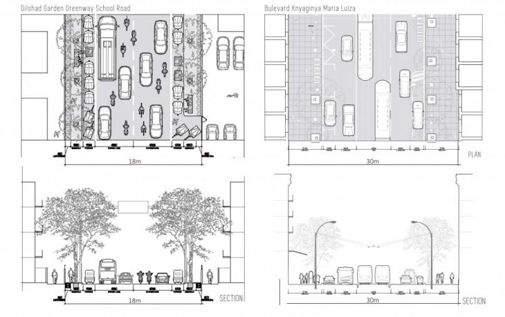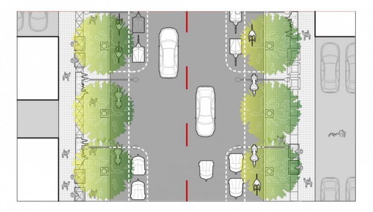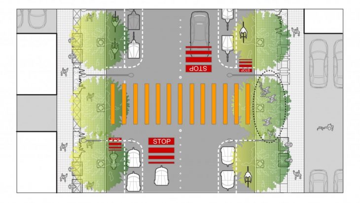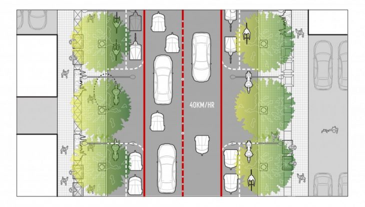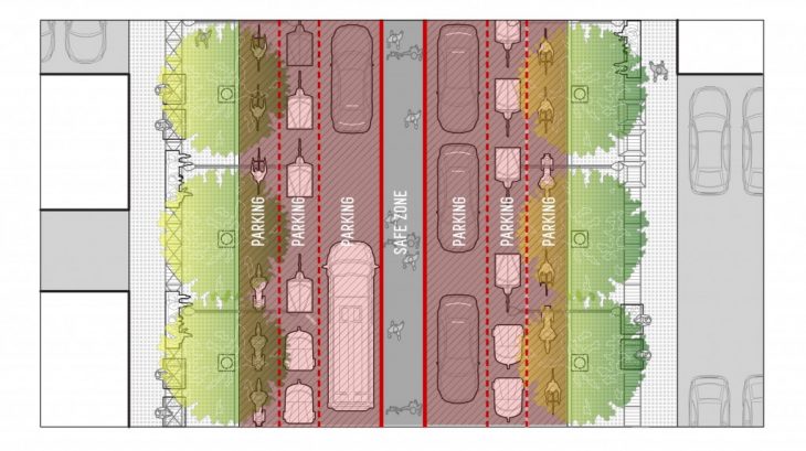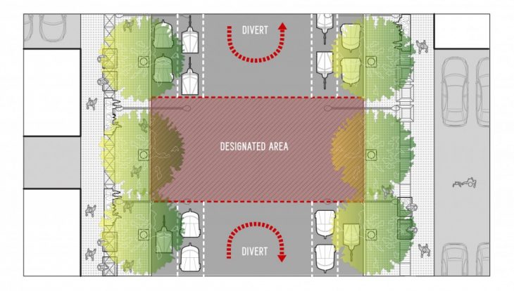 During cases of emergency, like earthquakes or fire hazards, the different lanes would be converted into parking zones and the section on the middle of the road would become the safe zone for people to evacuate.