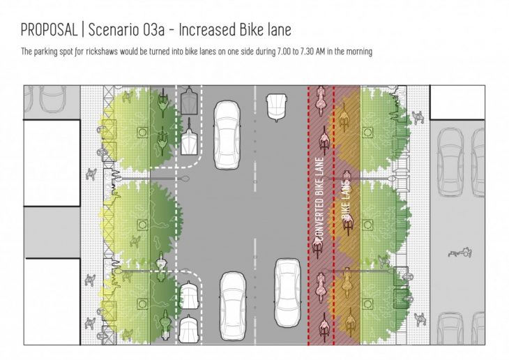 The parking spot for rickshaws would be turned into bike lanes on one side from 7.00 to 7.30 AM in the morning