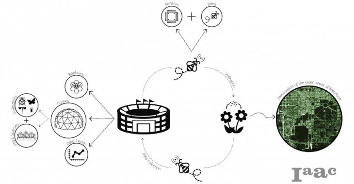 This large beehive will be designed not only to provide a safe home for bees but also as a large infrastructure node of the Internet of Bees. By attaching sensors of atmospheric content on selected bees it is possible to collect data from the city of Barcelona and create a better understanding of the invisible layers of the city.