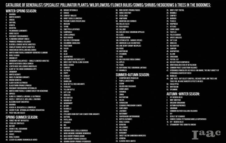 Catalogue of generalist/specialist pollinator plants/wildflowers/flower bulbs/combs/shrubs/hedgerows & trees in the biodomes.