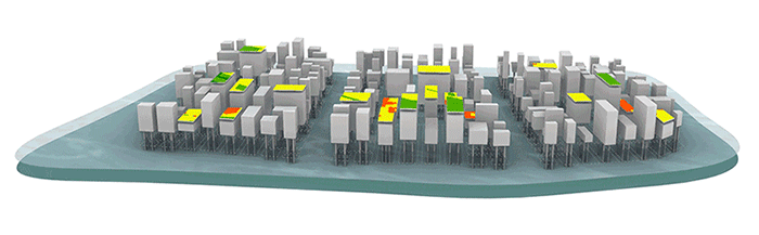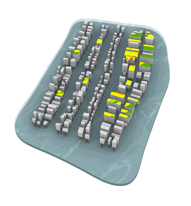 To tackle the issue of increased water levels a gene was connected to control all the heights of the buildings - Create plazas typologies
