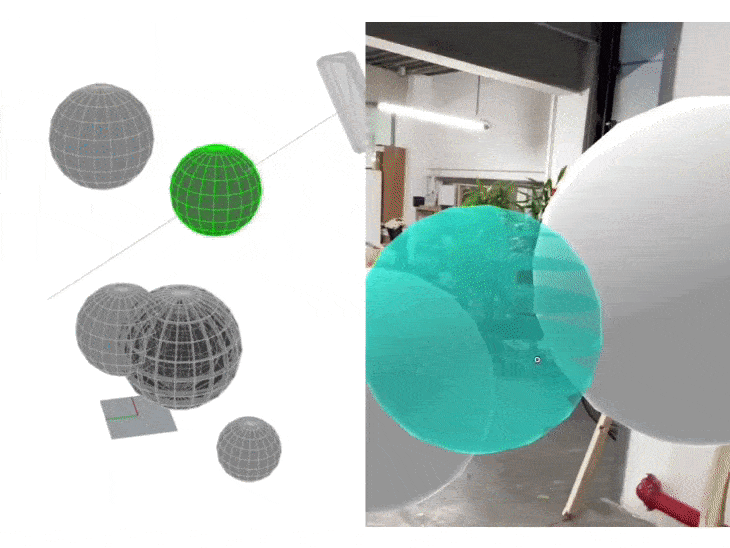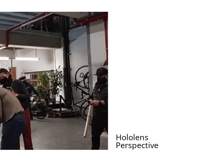 The effect is both magical and disconcerting – magical because of the way the hexagons disappear – shrinking to their centrepoints to reveal the real world behind them, as if they could float individually in space although together they make a kind of wall – and disconcerting because of how the Hololens wearer has to get so near to trigger the effect. Compared with a real door where you control passing through by a tried and trusted technique, such as using a handle or being clear the door is already open, this apparently closed and solid doorway with no handle requires a ‘leap of faith’ to try to walk into it. At the last moment being confident enough to try to walk into it makes most of it disappear and allows the real world beyond it to become visible.