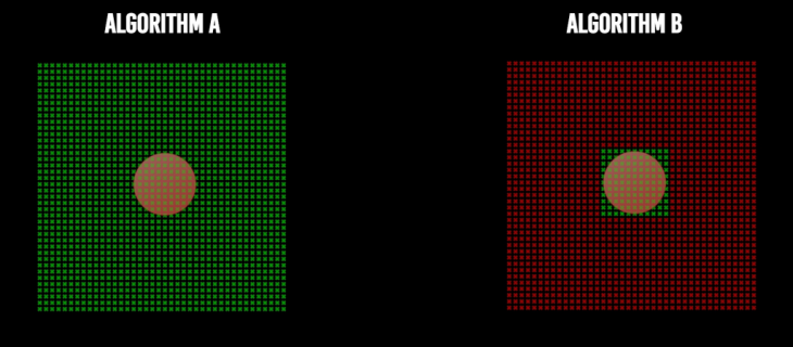 Figure 4. Collision-Detection algorithm run-time as a function of the number of voxels. Algorithm A checks all voxels while B depends on tool-domain
