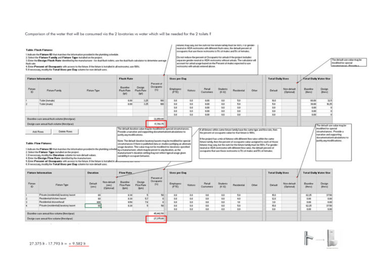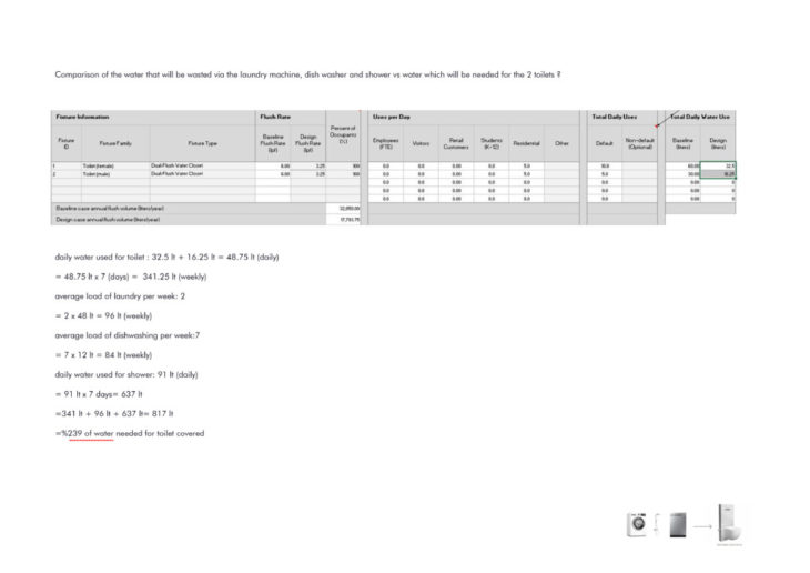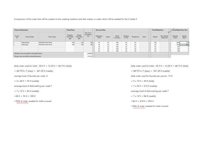 To reduce the use of potable water, the details of the grey-water strategy were to be determined. In order to do that, the “Indoor Water Use Reduction Calculator” was used to figure out how much water fixtures use/need on a daily and weekly basis.