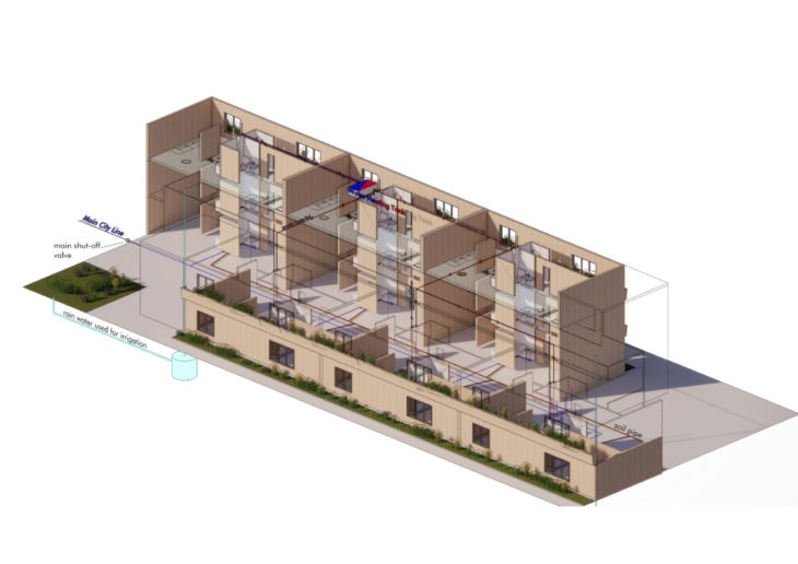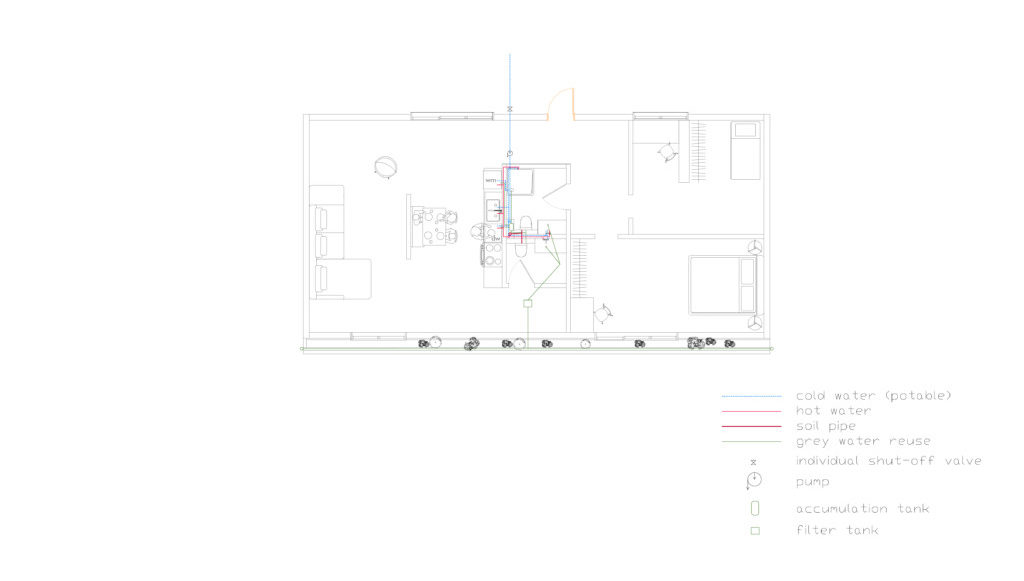After comparing the results, the determined grey-water strategy was for the dishwasher, washing machine, and shower liquid waste to feed the two toilets, while the two washbasins were directed to irrigation of the planters on each floor.