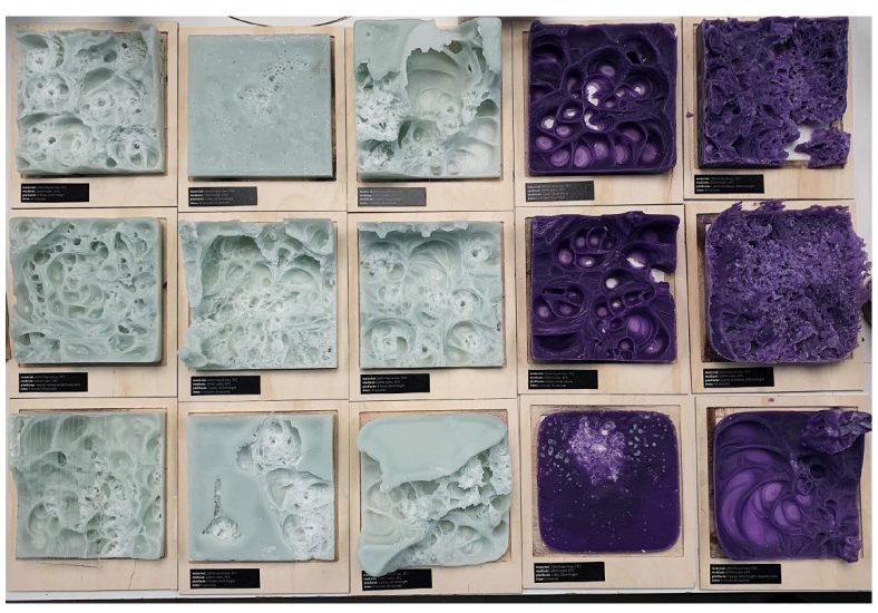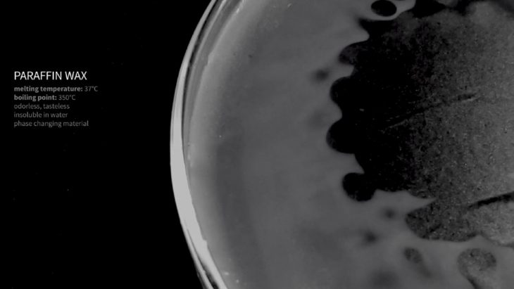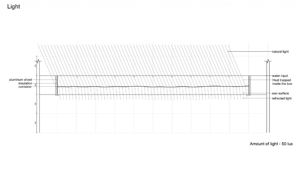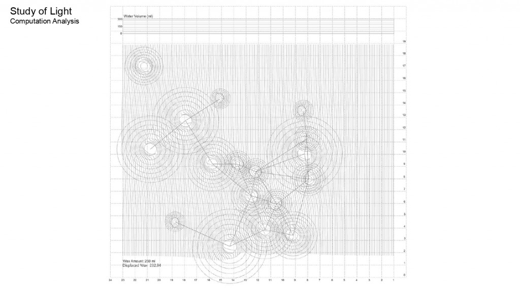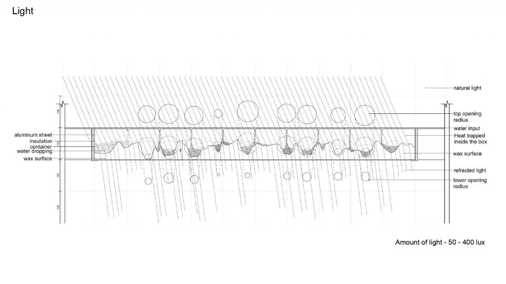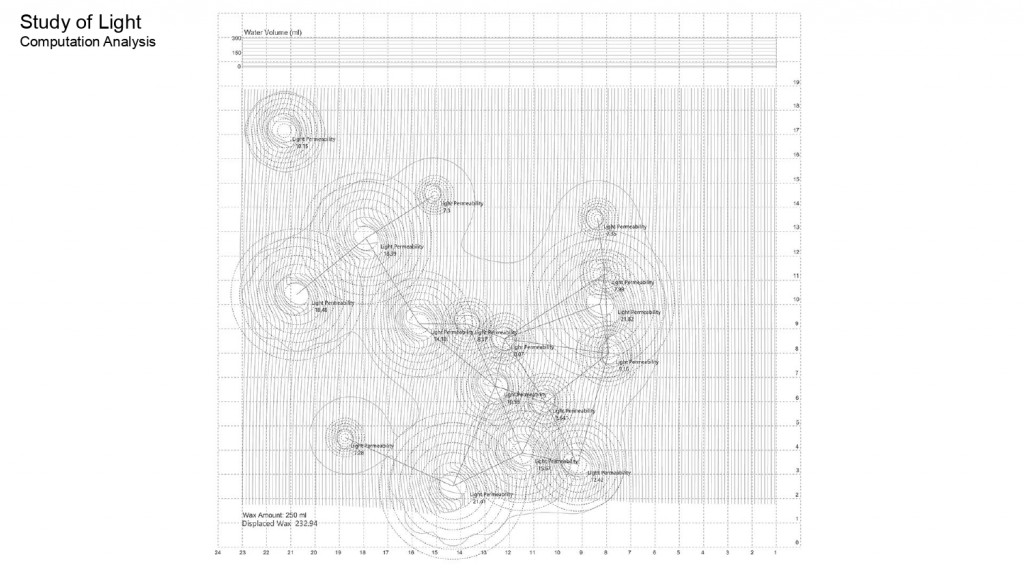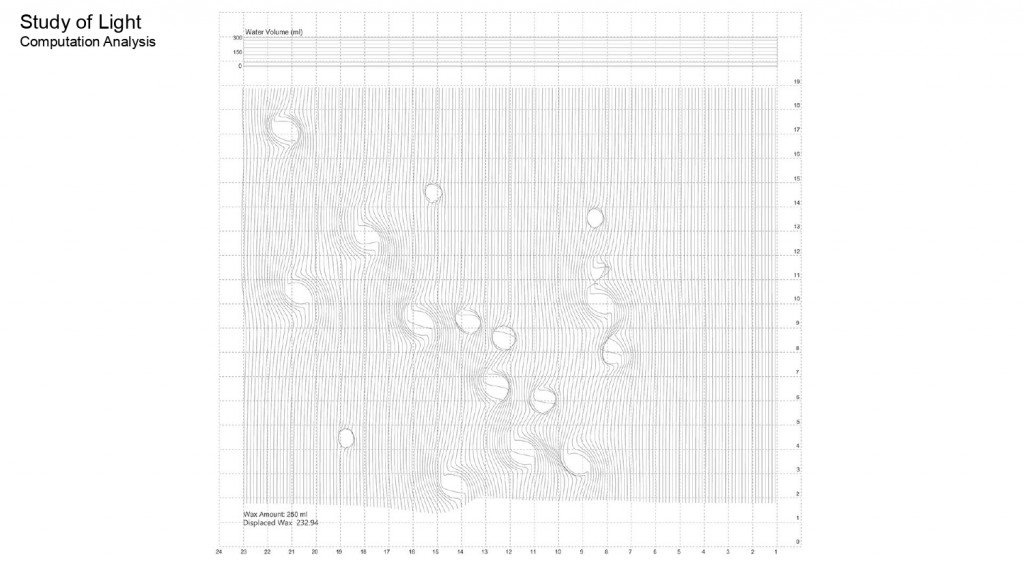 Water is used as an instrument to quickly cool and solidify the wax, and the outputs of water are controlled by a computational analysis of temperature and light permeability. The spots that initially receive more water, with a higher pressure, will have a higher permeability of light.