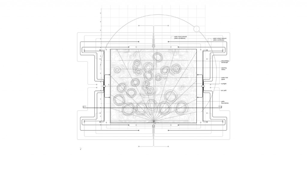 The site’s initial conditions were mapped, starting from its limits and evolving to the energies that influence the process. The walls of the surrounding apartment units were drawn as a way to understand the space. The existing pipes were traced in order to comprehend the flow of water in the site, so that they could be connected to the inputs and outputs of water in the system. The sun path was studied in order to maximize the solar radiation that reaches the container, so that there’s enough heat to melt the wax and enough natural light within the landscape.