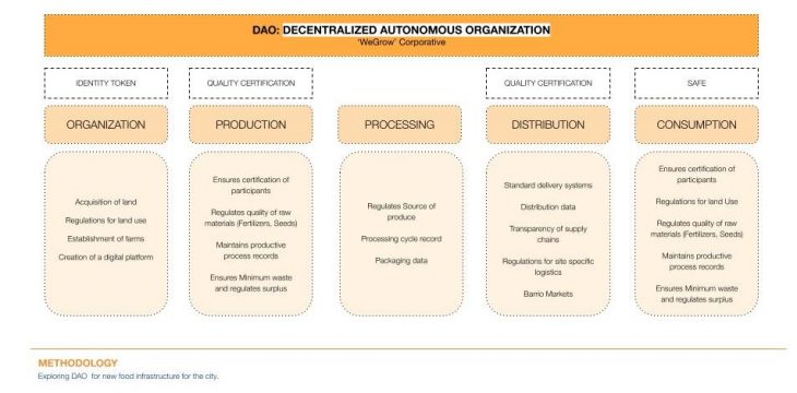 The We Grow project focuses on the use of Blockchain technology to establish a system that empowers Barcelona to grow its own agricultural produce to meet the consumption. The We Grow blockchain system works towards ensuring that the total production of yield tries to meet the demand within Barcelona, enhancing productivity & efficiency and minimizing wastage. This is achieved imagining food production as a civic amenity, where every citizen of Barcelona is eligible to receive certified agricultural yield. This is implemented by the city using buffer spaces on the outskirts along the highways as agricultural lands. Holistically speaking, the We Grow blockchain system ensures food security, transparency and accountability of yield, creating spatial interventions for food production to meet the consumption requirements of Barcelona.