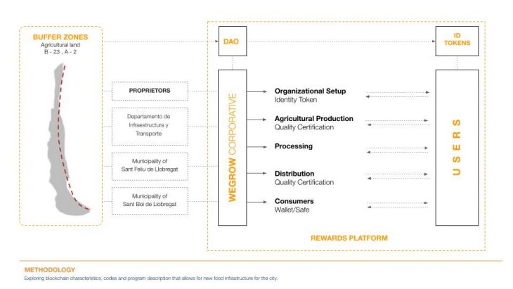 The We Grow Blockchain system is imagined to be a civic amenity initiated by the municipality of Barcelona which operates via a peoples cooperative regulated by a DAO. The municipality helps the We Grow cooperative to precure pasture lands located within buffer zones along the highways coming into the city for the sole purpose of agricultural production. The Proprietors of the land (Departamento de Infraestructura y Transporte, Municipality of Sant Feliu de Llobregat, Municipality of Sant Boi de Llobregat ) transfers ownership of the land to the We Grow cooperative under explicit regulations monitored by a DAO and reported to the municipality.