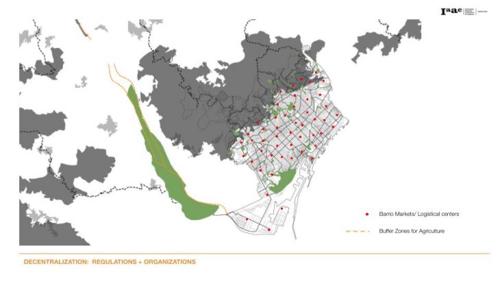 The buffer lands on the outskirts of the city of Barcelona under the ownership of the We Grow cooperative are used for Agricultural production for the city. The system uses otherwise non productive land and justifies its purpose for agricultural purposes. The regulations for land use is monetized by the DAO. For distribution each barrio in Barcelona has a specific market which is responsible for selling these products to the consumers. Distribution centers enhances logistical efficiency, regulates surplus and minimizes wastage.
