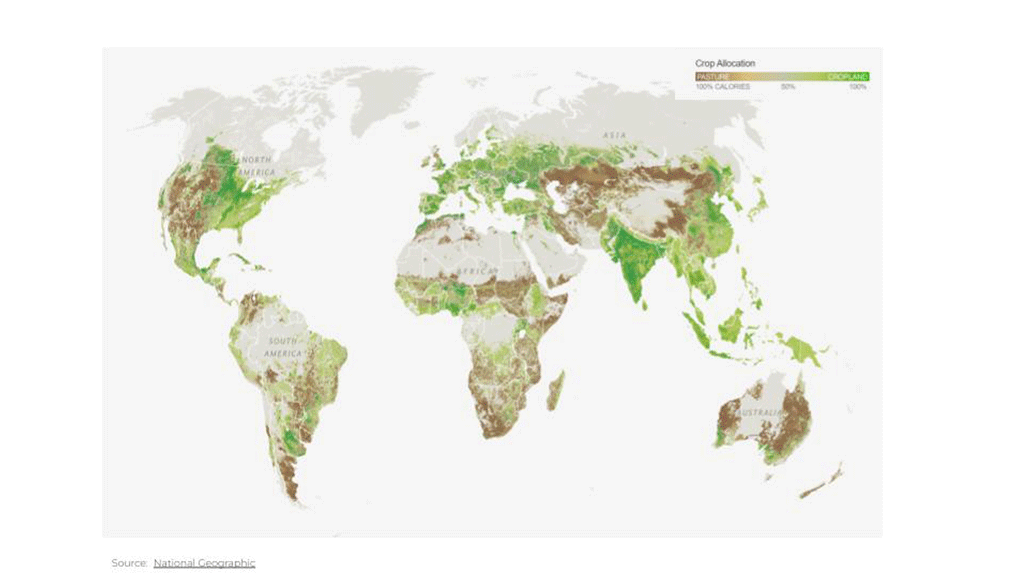 Map (A) indicates the distribution of agricultural lands across the planet.