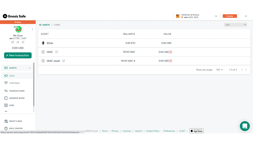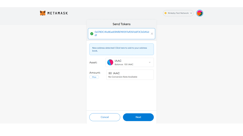 The actual chain happens through Ethereum testnet rinkeby. And uses custom tokens (currently name IAAC main, IAAC utility, and IAAC asset tokens). The transactions happen through mostly metamask for different users. The figure above shows the metamask wallet used for founding the project.