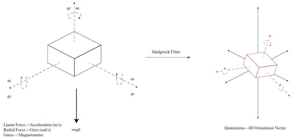 Similar to EMG data, IMU data also had noise and to get appropriate readings the data requires cleaning. We explored one of the efficient methods for IMU data cleaning in realtime. The method is “Madwick Filter“. The Madgwick filter formulates the attitude estimation problem in the quaternion space. The general idea of the Madgwick filter is to estimate W I q t + 1 by fusing/combining attitude estimates by integrating gyro measurements W I q ? and direction obtained by the accelerometer measurements.