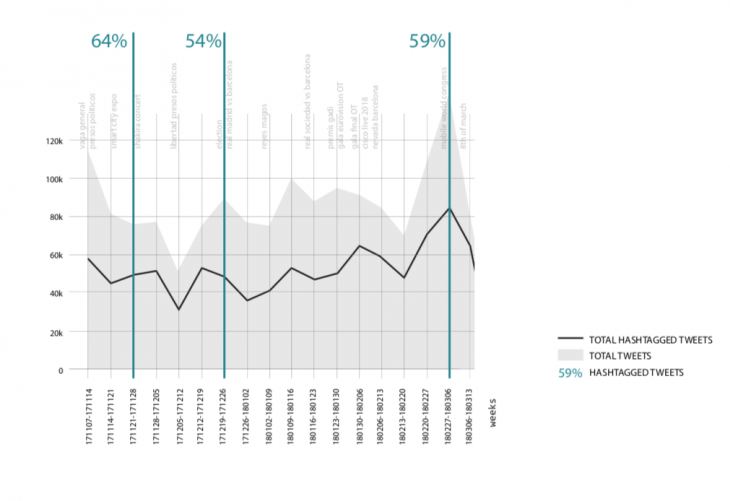 First, by plotting all of the hashtagged tweets over time and comparing them with all of the tweets, one can immediately identify certain periods of activity and “increased intention,” that is, weeks during which the percentage of hashtagged tweets increased relative to total tweets.