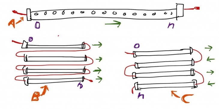 The basic screen requires a minimum of 8 lines of led for the visualization of the text. So the 5 m strip have been cut in order to have 8 led strips with 37 led each. The strips have been connected each other welding cables (that connect 5v, data and ground line) and a power supply.