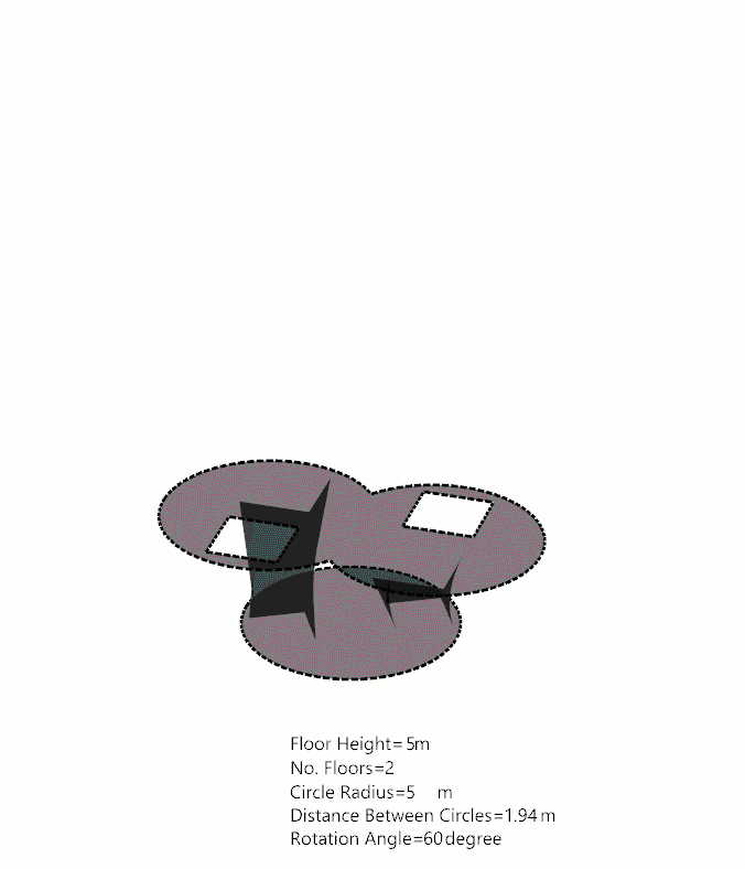 The rotation of the platforms at each level has been tested against environmental analysis including solar radiation simulation. In order to minimize self-shading and maximize sun exposure to the lower levels of the structure, an optimal range of rotation angles was established. The outcome minimum and maximum rotation angle was an input for a further view analysis study.