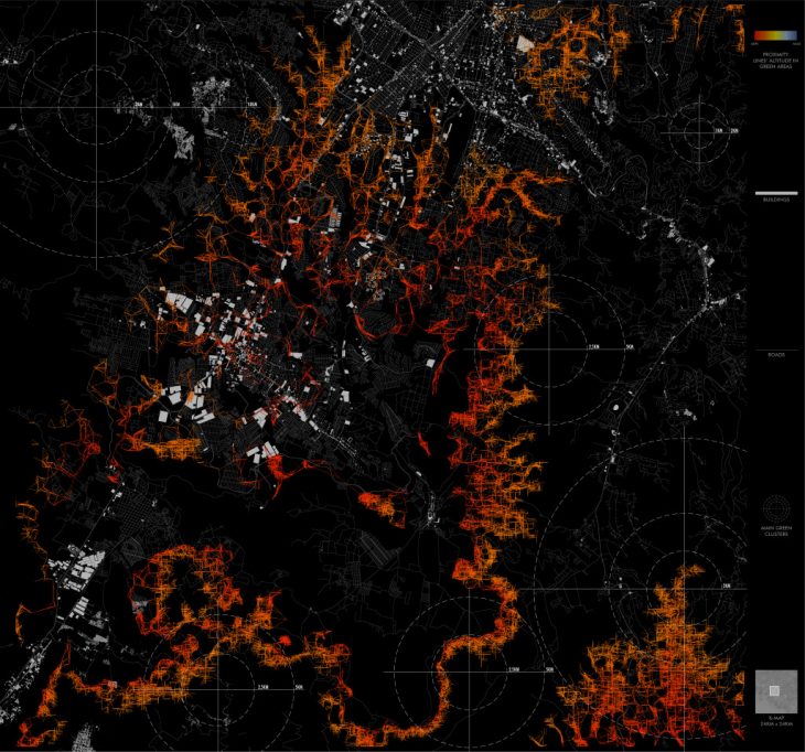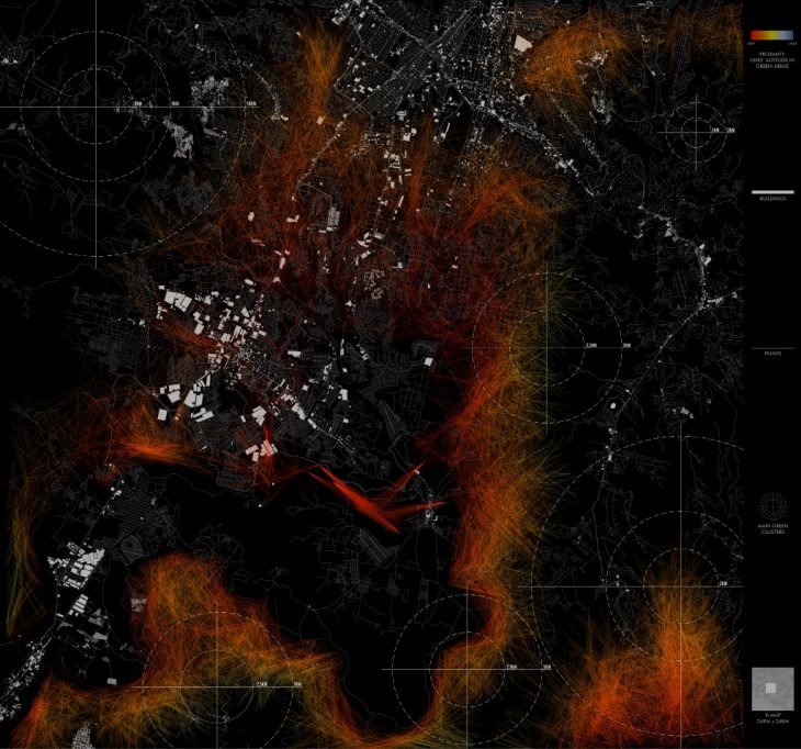 In the final drawing, both minimum paths were overlapped with the topography contours, the green areas and the human elements, such as main roads and building, in order to find the contact points among wildlife and human beings. The identity of different intersections changes according to the kind of animal. Indeed, regarding the Quetzal, as a bird, the future green rooftops will be the contact points. The black howler, as a ground animal, across the main roads; therefore, those contact points were spotted (with purple crosses in the drawing).