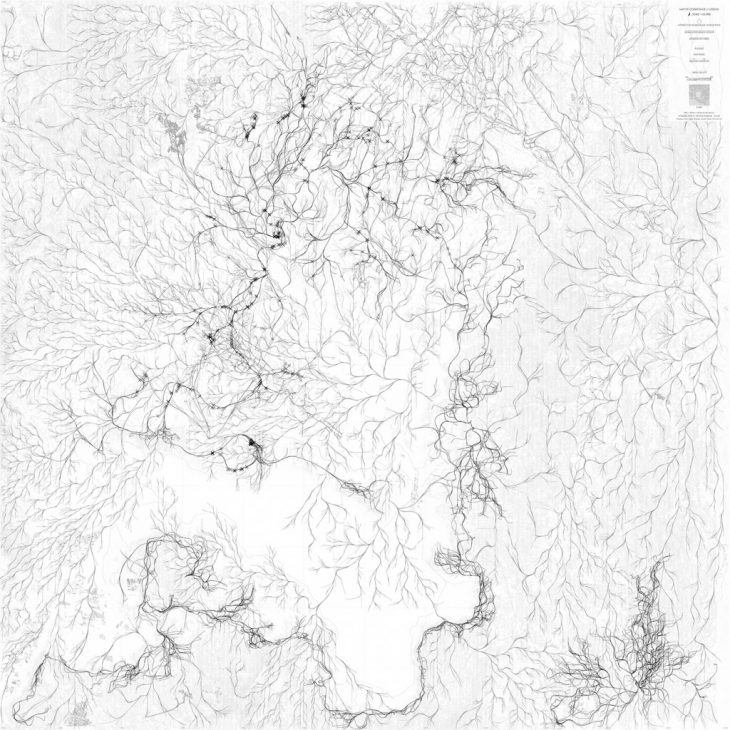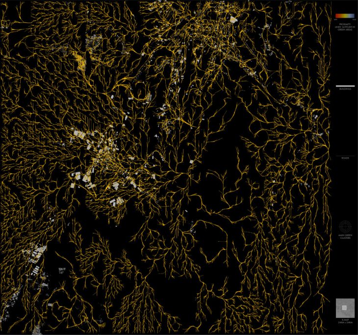 We modeled potential habitat paths for these four species using algorithmic projections with their travelling distance. Using flow lines, proximity lines and minimum paths, we plotted movement routes for each species, connecting current habitats with their projected locations under the green area intensity.