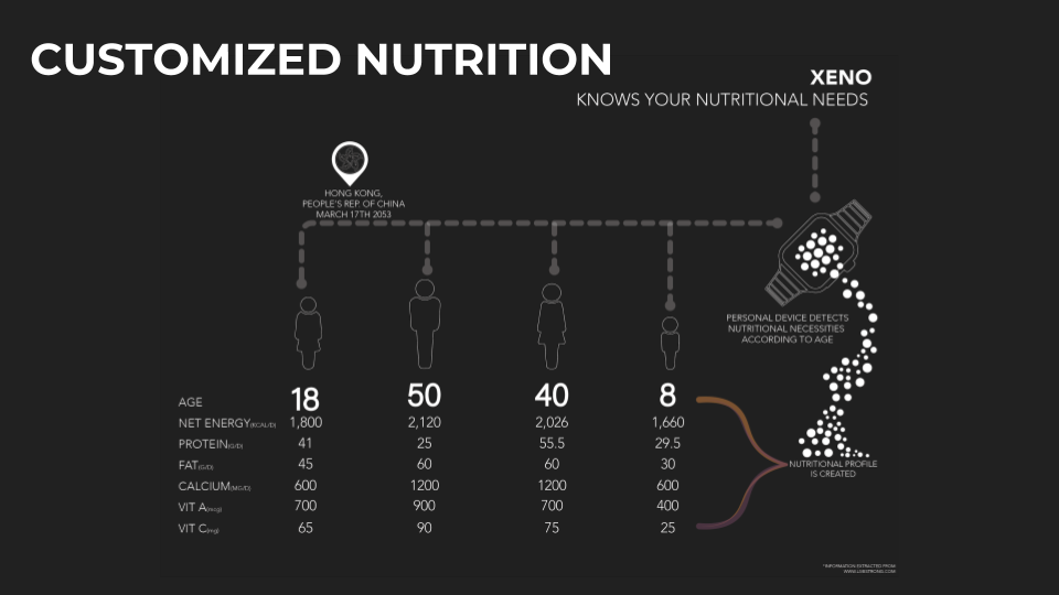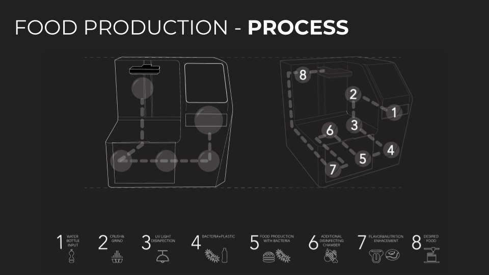 An artefact from the future, Xeno, uses non-toxic plastics as an input to be disintegrated by genetically modified bacteria ideonella sakaeinsis to form enzymes that are used in the production of food of the future. Nutrients, flavours, colour, texture and aroma is integrated with the enzymes to create customizable food. Xeno is a domestic appliance that can track your dietary needs and tailor your meals accordingly.
