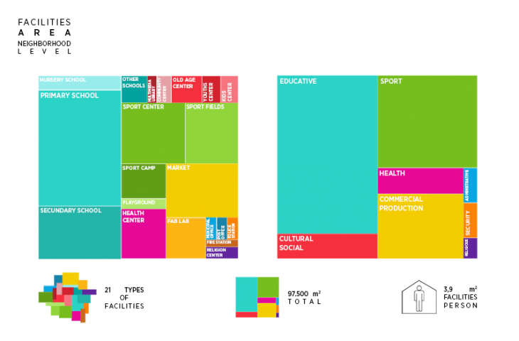 This graph indicates the provision of different types and categories of facilities in the neighborhood. Facilities cover a total area of 97.500 m2, that means 3,9 m2 of facilities per person. Educational, sport and commercial-production facilities are the one that require more space : 40.600 m2 for nursery, primary, secondary and other types of schools, 23.400 m2 for sport centers, sport fields, a sport camp and playgrounds and 14.200 m2 for markets and fab labs.