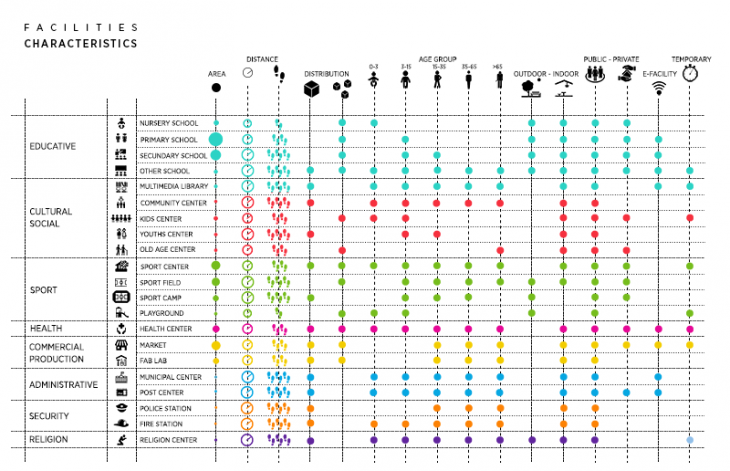 Facilities are commonly defined by standards. In the table about the characteristics of facilities are expressed the main standards of the facilities in the prototype (excluding city level facilities). Area (size of the facility, expressed in m2) and distance (influence area, expressed in meters or minutes walking) are ones of the most important standards in the planning of facilities. Distribution refers to the location of facilities (one or various locations) according to the scale of the facility. Age group category express the type of age group that the facility serves. Some facilities requires an indoor space and others are locate outdoor in public open space. Most of the facilities are public, but in some cases (education and health, for example) could be offered by privates. Not traditional standards for facilities are expressed in the last two rows of the table: e-facility and temporary. The first refers to the concept of distance facility (e-education, e-health, e-commerce, etc.) and the second explain if the facility can work also in a temporary mode, in specific moments of the day or of the week (night or weekly markets,) or in a no permanent location (pop-up facilities).